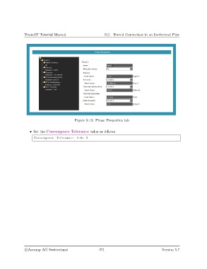 TransAT Tutorial Manual 9.2. Forced Convection in an Isothermal Pipe Figure 9.13: Phase Properties tab • Set the Convergence Tolerance value as follows Convergence Tolerance : 1.0 e−5 c Ascomp AG Switzerland 371 Version 5.7